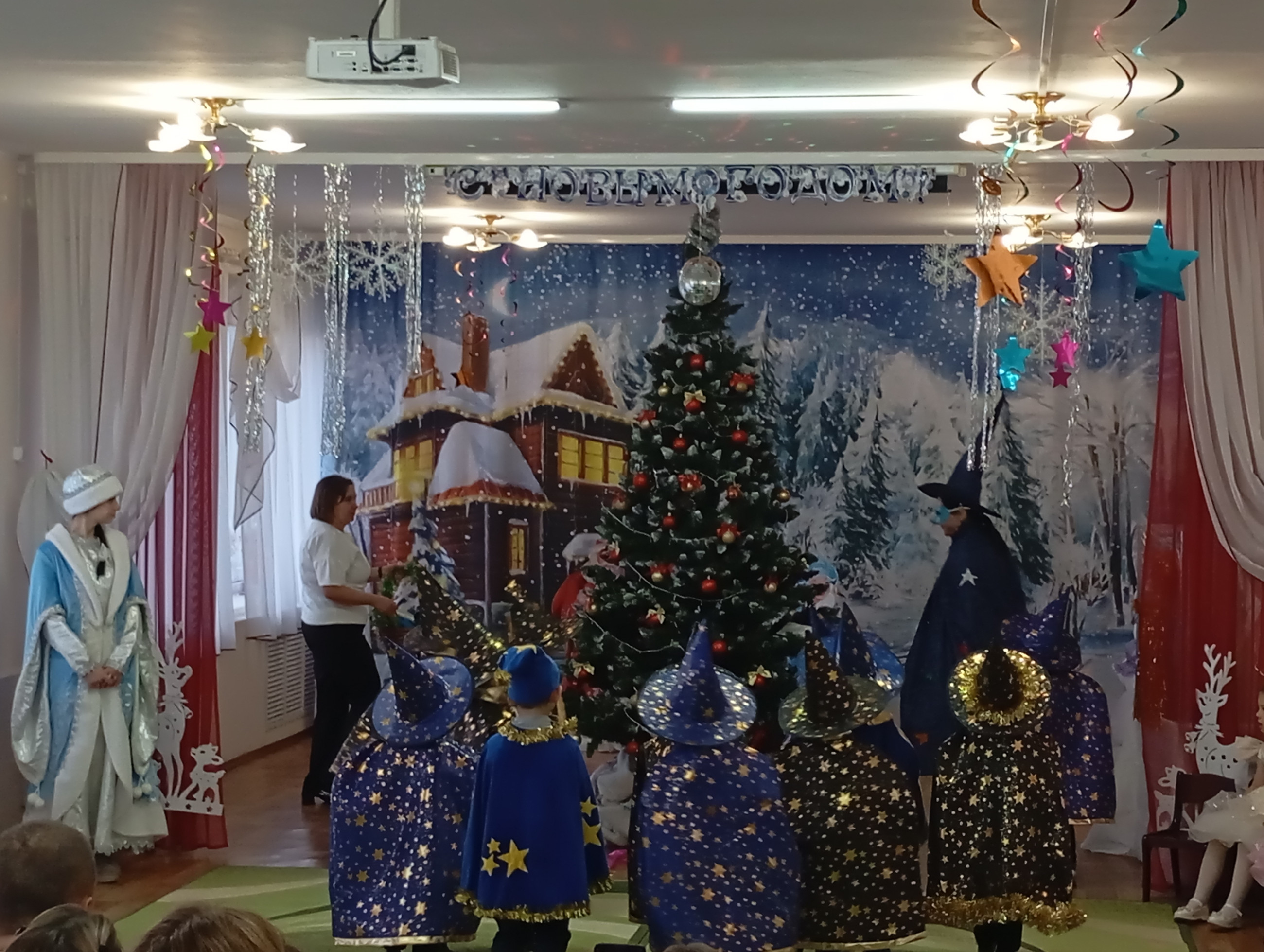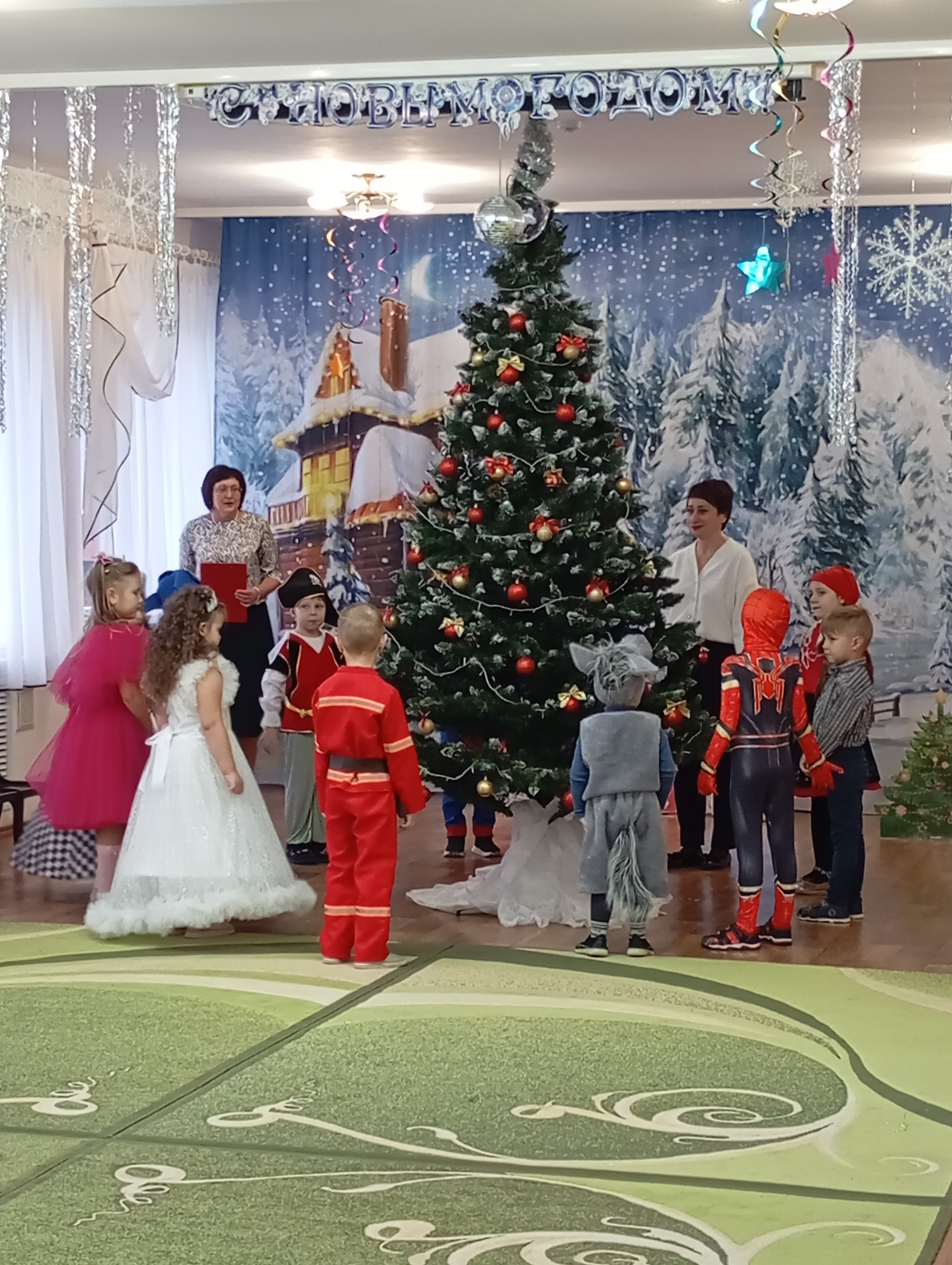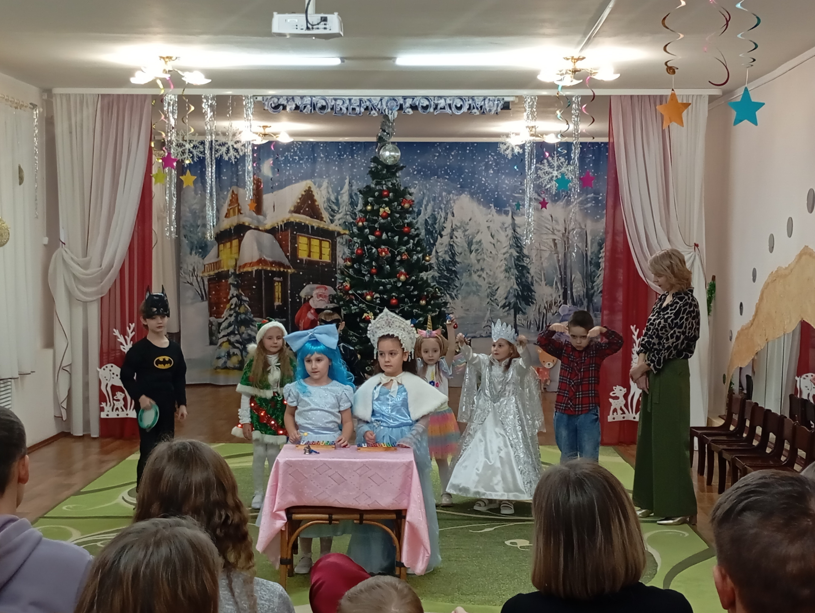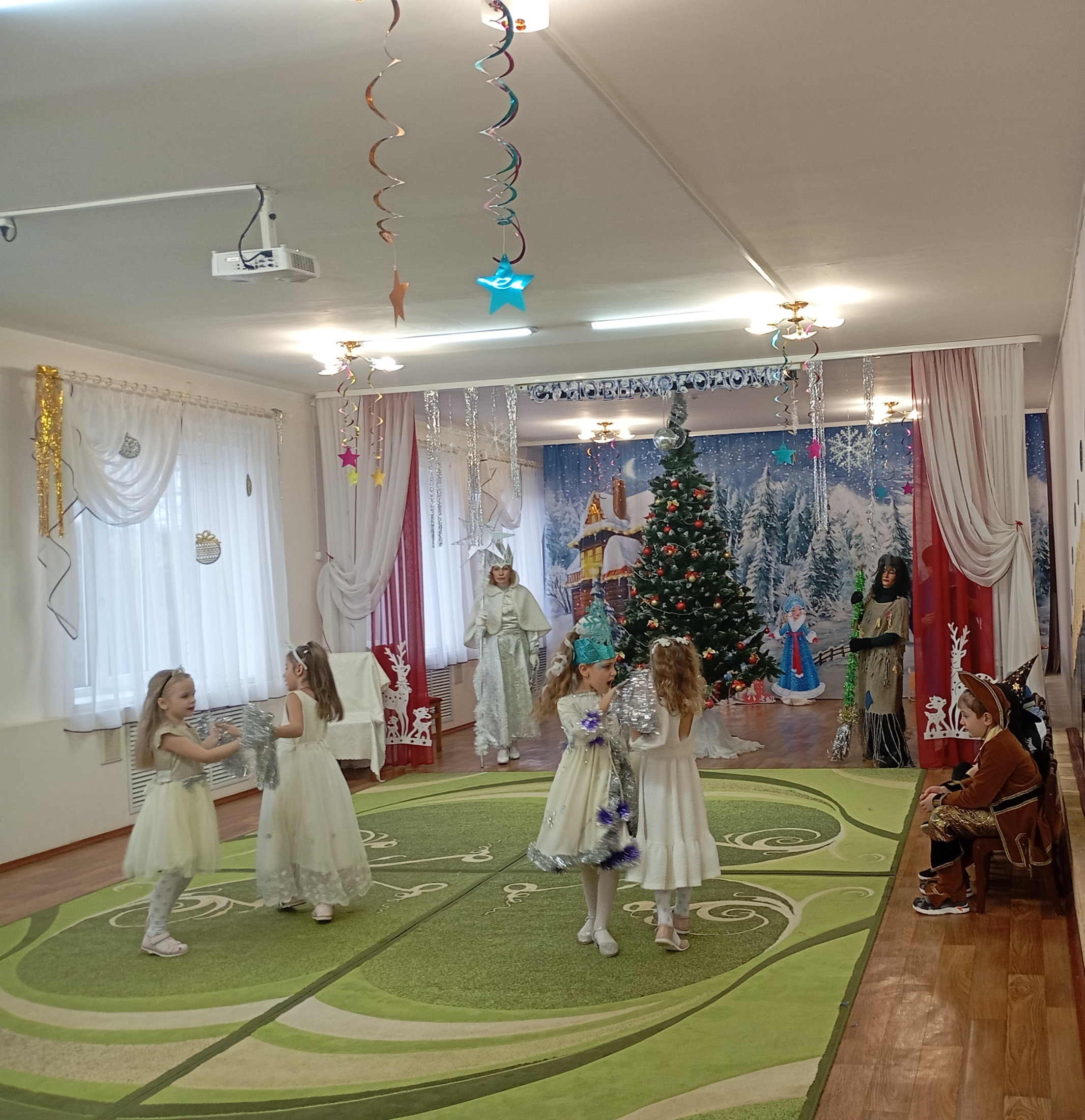Музыкальный зал преобразился до неузнаваемости: сверкающие гирлянды, тематические фотозоны и, конечно, главная героиня — пышная новогодняя ель, украшенная игрушками.
