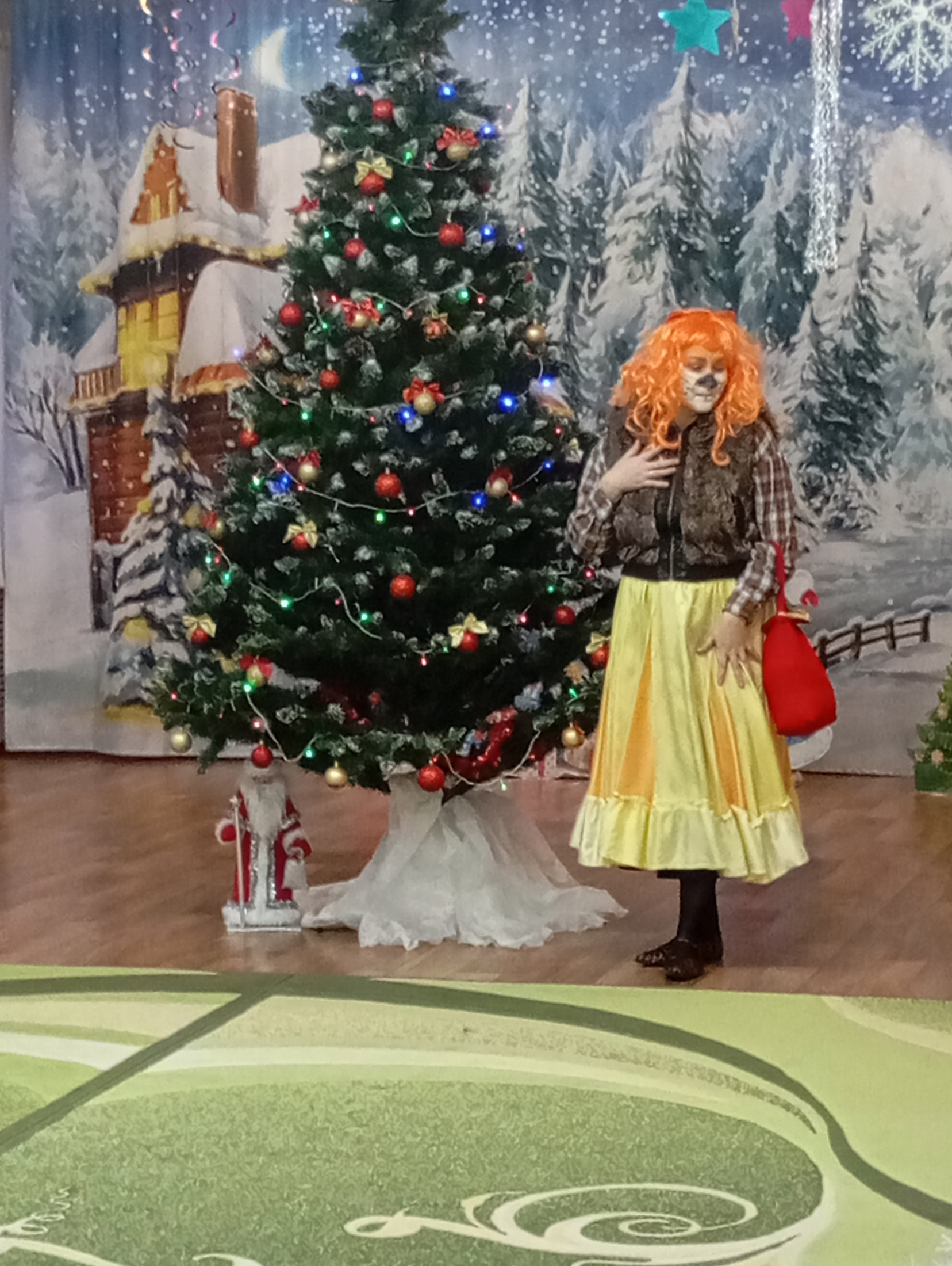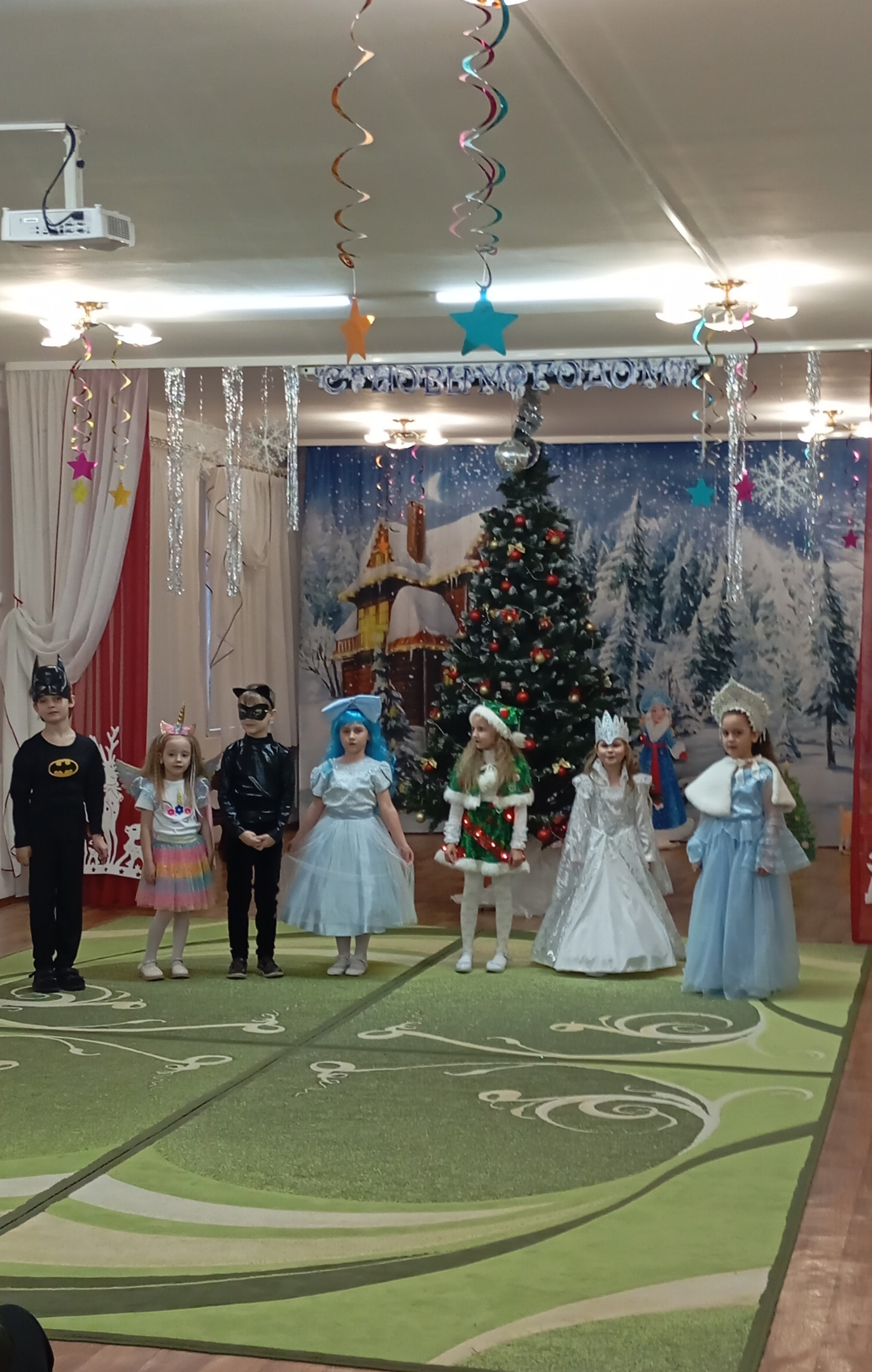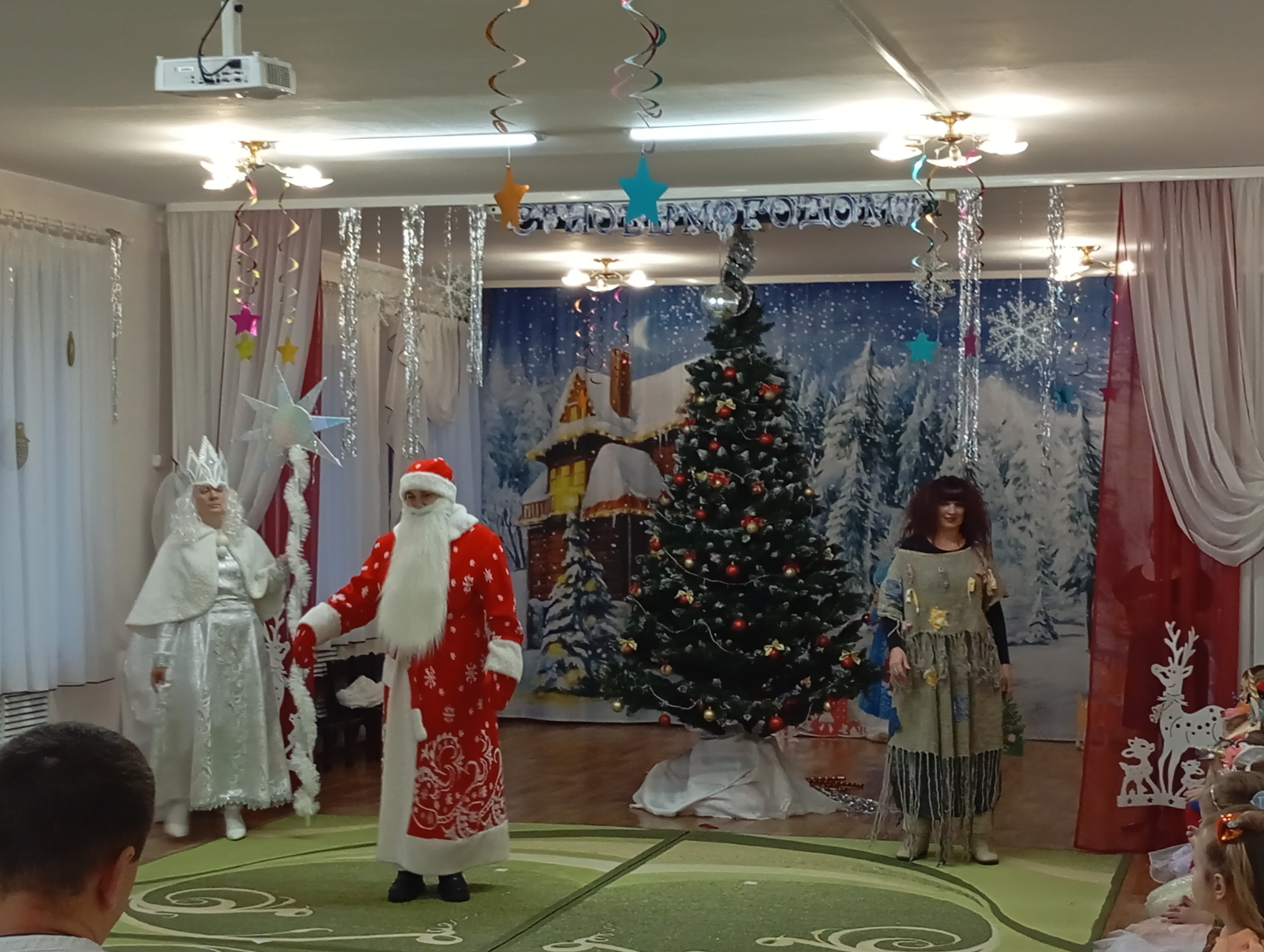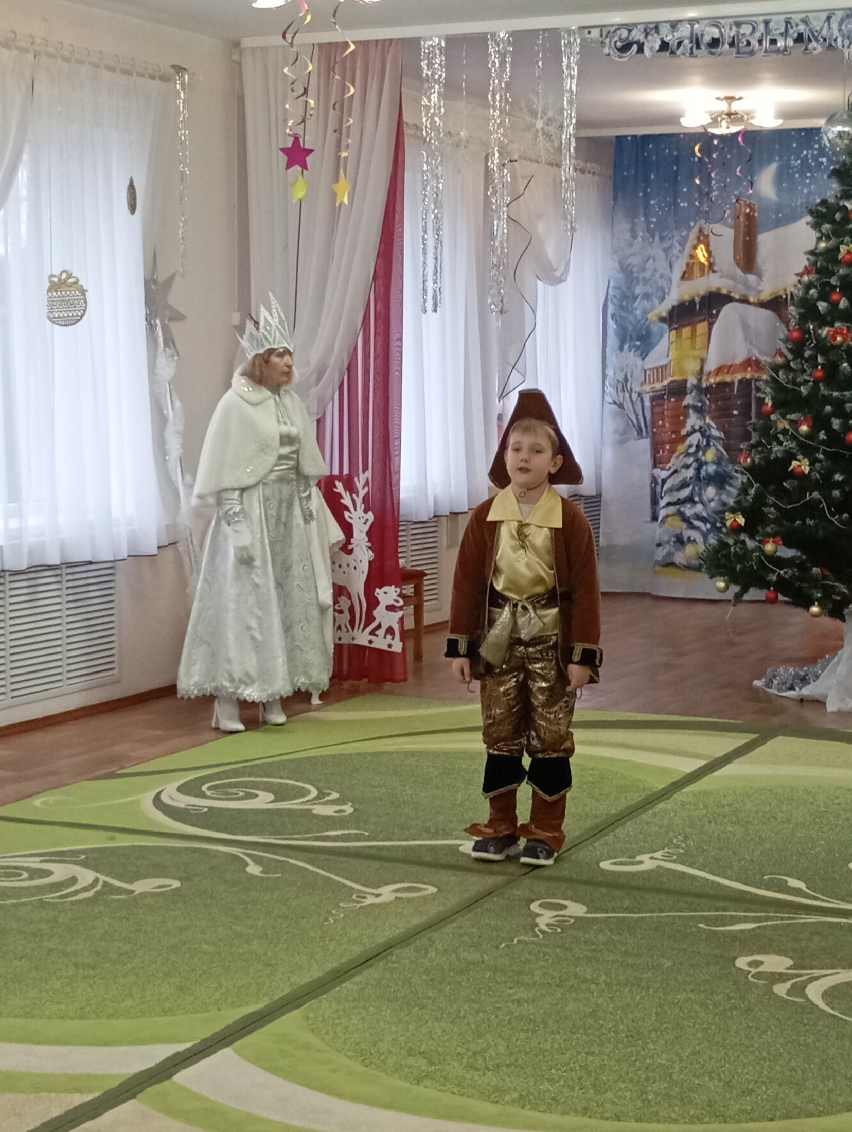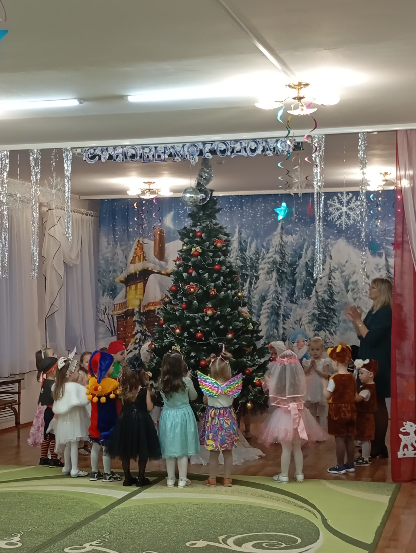 Музыкальный зал преобразился до неузнаваемости: сверкающие гирлянды, тематические фотозоны и, конечно, главная героиня — пышная новогодняя ель, украшенная игрушками.