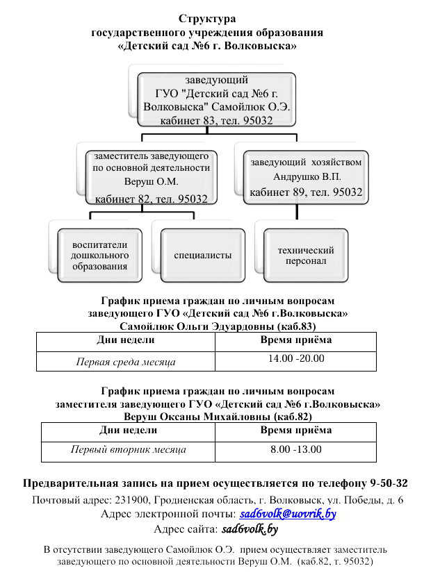 График приёма граждан по личным вопросам в государственном учреждении образования "Детский сад №6 г.Волковыска"